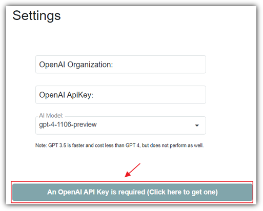- When you first run the program you will be presented with the Settings page. You must enter a valid OpenAI key to proceed. If you don't have an OpenAI key, click the button to navigate to the OpenAI page to obtain one.